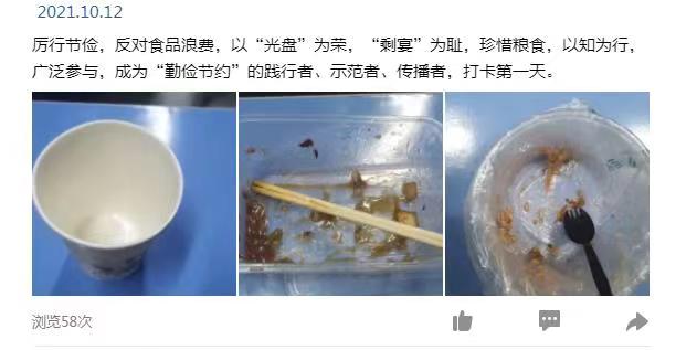 活动中,大家共同学习了习近平总书记关于制止餐饮浪费行为的重要指示精神和相关文件,观看了演讲视频《全球每年1/3食物被浪费,人类如何靠嘴守护未来?》,最后,在《倡导厉行节约、反对奢侈浪费》倡议书上签字。另外,还启动了“一日三餐光盘打卡活动”,党员带头践行“光盘行动”,将一日三餐光盘行动打卡拍照,在QQ、微信等社交平台分享“光盘”照片。