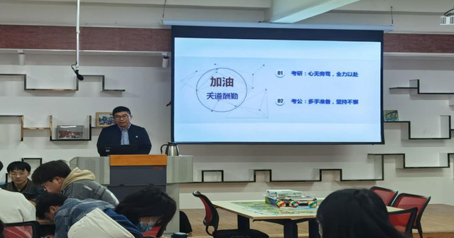 岳林琳从考研和考公两个层面与大家进行了交流。他结合很多专业老师及历届考研成功上岸同学们的经验,从考研信息搜集、学校与专业选择、专业课与公共课复习、初试和复试准备、导师选择与调剂等方面与大家进行了考研交流,鼓励大家考研的过程中要做到心无旁骛、全力以赴。接着,他从考公信息搜集、考试题型分析等方面与大家进行了考公交流,并结合历届考公、考事业编成功上岸同学的实例,鼓励大家考公过程中要做到多手准备、坚持不懈。最后,岳林琳老师告诫大家,对自己的发展要进行投资,通过好好学习来实现发展目标是性价比最高的投资策略。