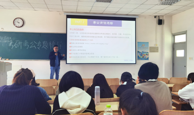 岳林琳老师通过2024年考研形势分析引出话题,从考研信息获取、专业课复习、公共课复习、初试准备、复试准备、调剂等方面展开详尽论述,提醒同学们要精准把握、认真准备,切勿眼高手低、好高骛远。针对考公考编,岳老师介绍了岗位信息收集的渠道,帮助同学们打破信息差,同时还纠正了同学们对考公存在的错误认知,提醒同学们要多手准备、把握规律、坚持不懈。